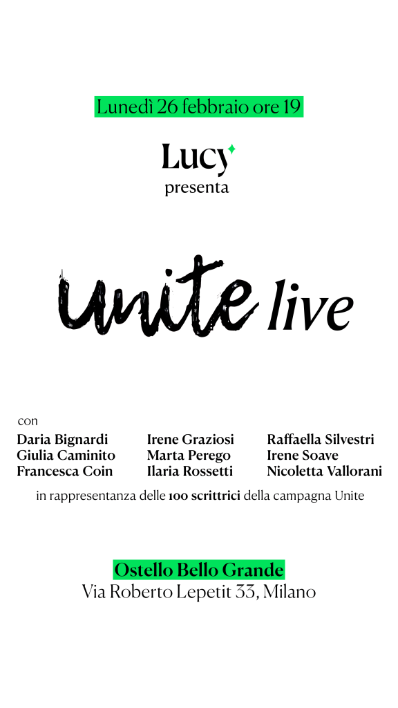 Il primo evento live di #Unite, l’azione letteraria di scrittrici e giornaliste contro la violenza di genere, si terrà a Milano lunedì 26 febbraio, ore 19, con la cura di Lucy. Sulla Cultura.